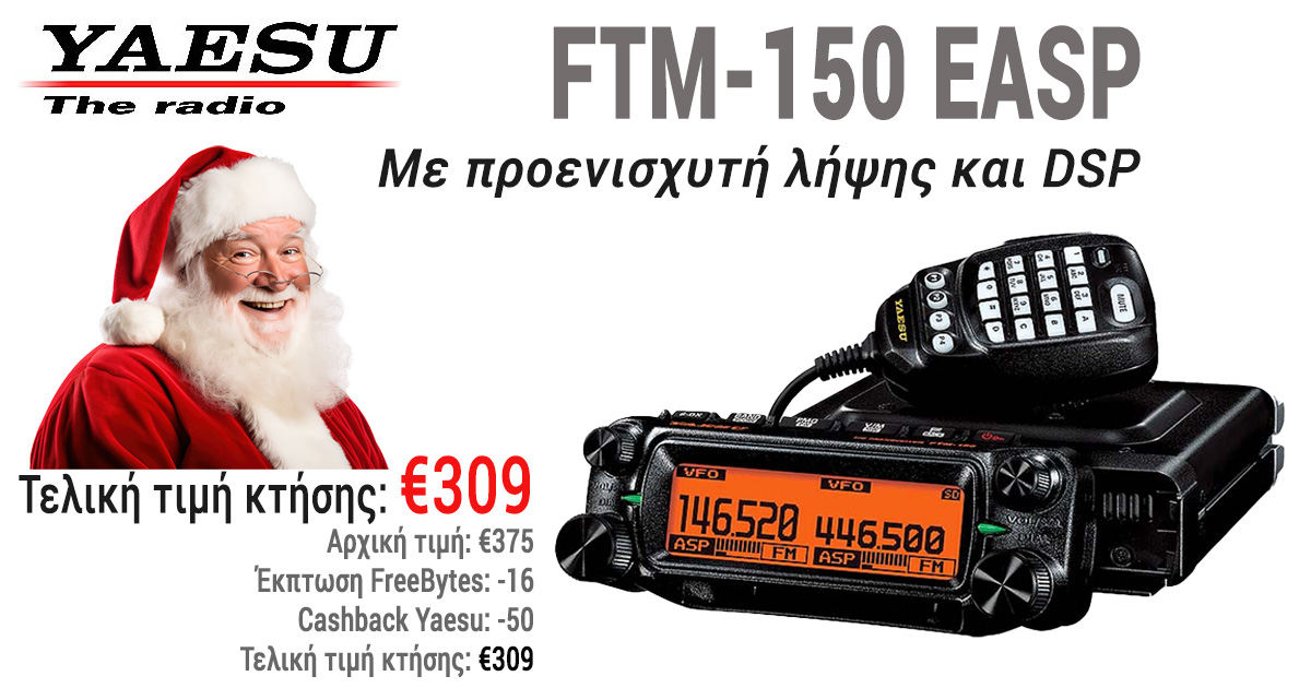 Η Yaesu ανακοίνωσε το νέο πρόγραμμα επιστροφής χρημάτων "Holiday Special 2025". Η διάρκεια του νέου προγράμματος είναι από 6 Νοεμβρίου μέχρι 31 Δεκεμβρίου 2025. Με το νέο αυτό πρόγραμμα μπορείτε να αποκτήσετε το FTM-150 EASP με επιστροφή €50 από την Yaesu. Αντί της τιμής προσφοράς των €359 η τελική τιμή κτήσης του Yaesu FTM-150 EASP, μετά την επιστροφή είναι €309. Για να γίνει η διαδικασία επιστροφής χρημάτων πρέπει να συμπληρώσετε την φόρμα στην διεύθυνση: https://yaesucashback.co.uk