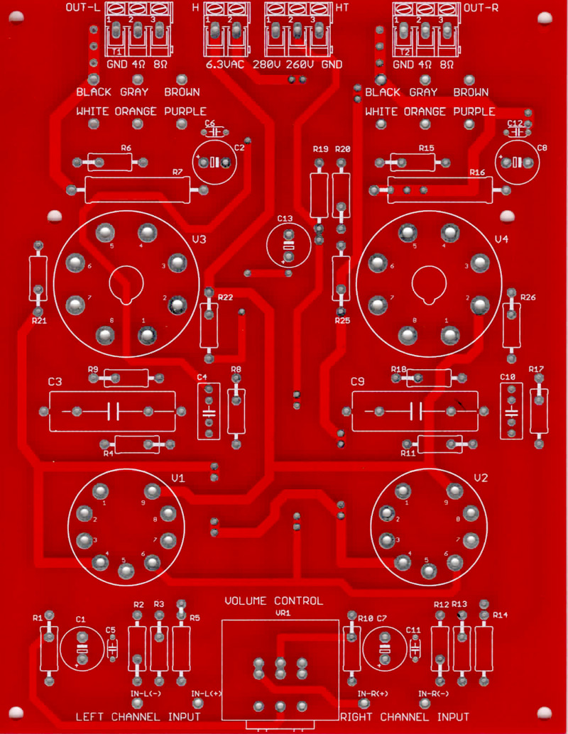 Με αυτή την πλακέτα μπορείτε να κατασκευάσετε στερεοφωνικό ενισχυτή ήχου σε τάξη Α'. Σε κάθε κανάλι χρησιμοποιείται από μία λυχνία ECC82 και μία EL34. Το σχέδιο του ενισχυτή μπορείτε να το κατεβάσετε από εδώ: RK8234 Schematic